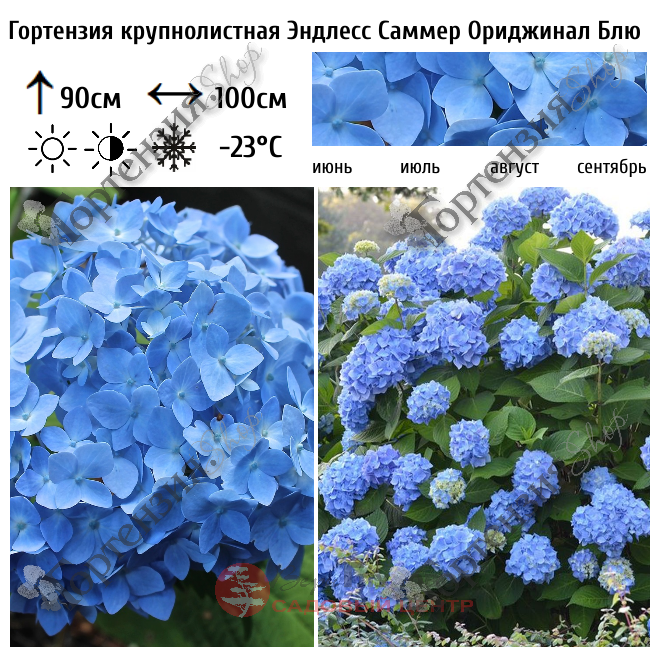 Гортензия крупнолистная Endless Summer ® The Original Blue - первый из сортов гортензии в коллекции. Цветет на одревесневших стеблях прошлого года и на ростках нового сезона. Выносливая, устойчивая к болезням и проверенная временем гортензия. Original может цвести как привлекательная голубая гортензия ИЛИ розовая гортензия, при необходимости регулируя уровень pH почвы. Куст средних размеров – 90-110 сантиметров, с широкой кроной. Стебли прочные, ветвистые с большим количество листвы насыщенного зеленого цвета. Период цветения – июнь-сентябрь. Яркие голубые крупные цветочки собраны в плотные шаровидные соцветия. При обрезке после первого цветения растение зацветет повторно. Сорт желательно располагать на солнце либо полутени, на влажных почвах с хорошим дренажом. На зиму требует укрытия.