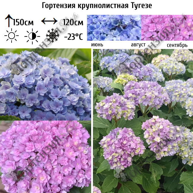 Гортензия крупнолистная Тугезе (из серии «You & Me») - очень красивый обильноцветущий сорт. Компактная, с густой кроной и крупной листвой высотой до 150 см.Изящные очень крупные, махровые соцветия состоят из многорядных звездочек, в начале распускания зеленоватые, затем розовые или голубые тона (в зависимости от кислотности почвы), а в полном роспуске и по мере вегетации приобретают более насыщенные красные или фиолетовые оттенки. Цветет на побегах прошлого и текущего года, с июня и до наступления заморозков.Морозостойкость 5 зона (до -23°С). требует укрытия на зиму.
