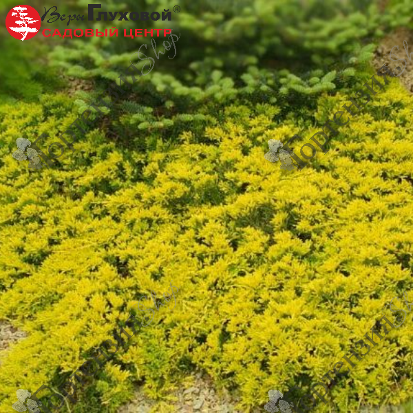 Можжевельник горизонтальный Голден Карпет (Juniperus horizontalis Golden Carpet) - популярный стелющийся сорт можжевельника с ярко-золотистой хвоей. Высота растения не превышает 15 см, и диаметр кроны 2 м. Растет медленно, по 10 см в год. Побеги длинные стелющиеся сверху покрыты золотистой, чешуйчатой, мелкой хвоей, снизу желто-зеленой, покрывают землю словно ковром. Отлично подойдет для украшения альпинария, хвойных клумб, послужит ярким украшением для любой композиции. Любит солнечные места, в тени золотистая окраска тускнеет. К плодородию почвы нетребователен, однако самые хорошие условия для можжевельника – это легкие, умеренно влажные, хорошо дренированные почвы с реакцией от слабокислой до щелочной. Зимостоек. Устойчив к городским условиям.