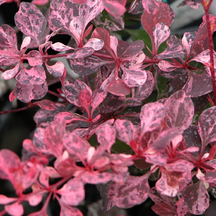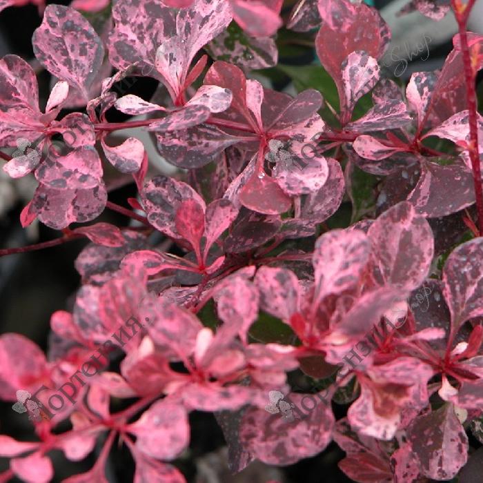 Барбарис тунберга Пинк Куин - раскидистый кустарник с округлой кроной, высотой до 1,5м и диаметром до 2м. Листья яйцевидные, блестящие. Листья красно-пурпурные с серыми и белыми пятнами и разводами, к концу сезона становятся коричнево-красными, осенью — карминово-красные. Издали растение выглядит розовым.