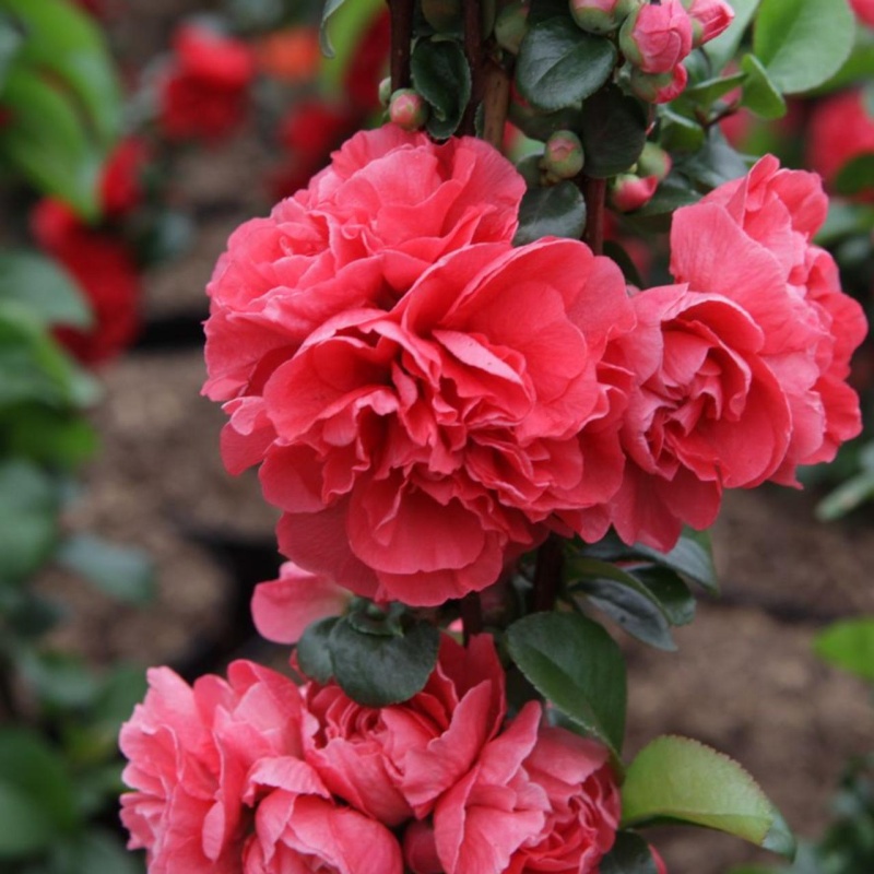 Хеномелес прекрасный (Chaenomeles speciosa) Пинк Шторм - плотный округлый кустарник, высотой и шириной до 1м. Побеги прямые, без шипов. Цветки диам.5 см, махровые, ярко-розовые, цветение обильное в мае. Листья глянцевые, тёмно-зелёные. Плоды отсутствуют.Место солнечное или полутенистое. Почва плодородная.