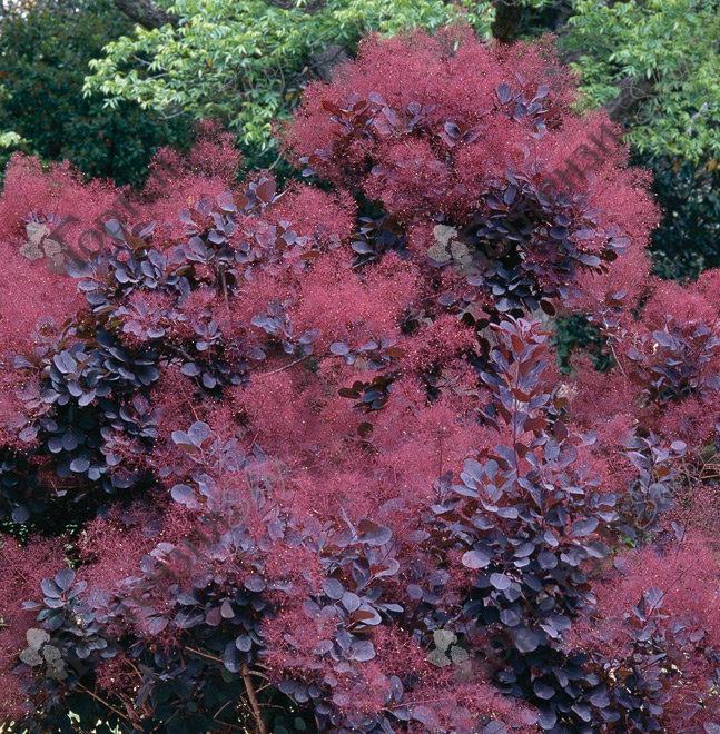 Скумпия кожевенная Роял Пурпл (Cotinus coggygria 'Royal Purple') - кустарник до 2–3 м высотой, с раскидистой, почти шаровидной кроной.Годовой прирост составляет 50 см. в высоту и 50 см. в ширину. Сорт с винно-фиолетовыми листьями с металлическим блеском. Цветки мелкие, собраны в верхушечные метельчатые соцветия до 20 см длиной, окутывающие куст с VІІ по Х, как пушистое тёмно-розовое облако. Недостаточно зимостойка, цветёт редко и рекомендуется как порослевая культура.