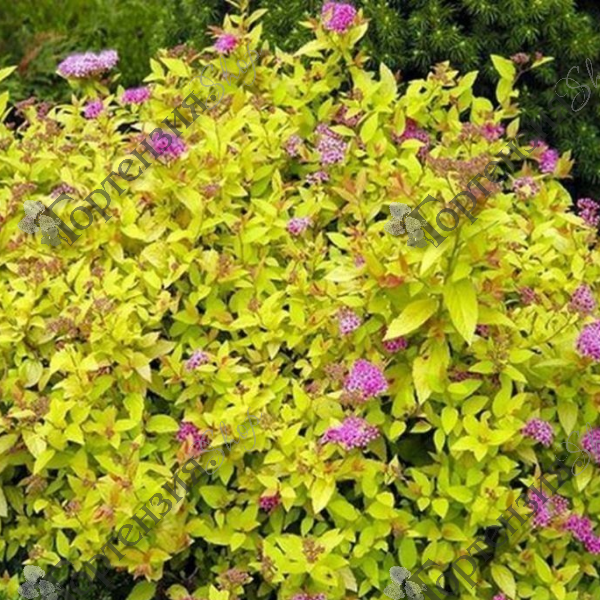 Спирея японская 'Голдмаунд'  ( Spiraea japonica 'Goldmound') - Красивоцветущий небольшой кустарник до 0,6 м высотой, с плотной, полукруглой кроной. Листья ланцетные, насыщенного желтого цвета в течение всего вегетационного периода. Обильно цветет с июня по июль, розовыми цветками, собранными в плоские щитковидные соцветия. Растет медленно. Зимостойкость высокая. Светолюбива, к почвам нетребовательна, но лучше цветет на рыхлых, плодородных и увлажненных. Устойчива в городских условиях. Для поддержания красивой формы кроны необходима весенняя обрезка.