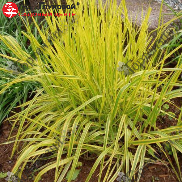 Растение, образующее достаточно плотную кочку, постепенно расползающуюся. Совершенно жёлтая листва отрастает очень рано, потом постепенно на листьях проявляются зеленые полосы. Летом листья вырастают до 30–40 см, осенью их длина   доходит до 70 см, они начинают эффектно поникать. Зеленые, потом коричневатые цветки-колоски на крепких стеблях имеют правильную цилиндрическую форму. Цветет в конце мая–июне. Любит влажные плодородные почвы. Используется для посадки в массив, создания яркого желтого акцента. Размножается делением корневища весной и осенью.