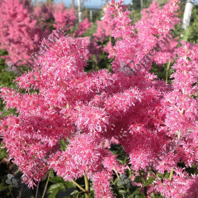 Астильба японская Рейнленд – многолетнее корневищное растение. Высота 50–60 см, диаметр до 60 см. Цветоносы прямостоячие бронзово-розовые. Листья темно-зеленые, блестящие, перистые, с острозубчатым краем. Соцветия – пушистые густые метелки-пирамидки длиной до 25 см из мелких цветков насыщенной розовой окраски. Цветет с конца июня по август.