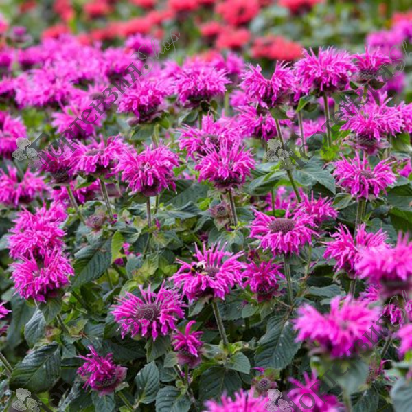 Монарда гибридная 'Би Фри' (Monarda hybrida 'Bee Free') корневищное многолетнее растение. Высота 50 см, листья пальчато-рассечённые, зеленые. Цветки трубчатые, ярко-розовые, почти фиолетовые, собраны в головчатых соцветий диаметром до 6—7 см, располагающихся одно над другим по стеблю, цветут с июня по август. Растение привлекает бабочек и пчел, листья и цветы ароматны. Морозостойкость -34С. Почвы предпочитает дренированные, кислые. Используется в миксбордерах, групповых  посадках,  в альпийских горках, бордюрной посадке и на срезку. Монарда также ихвестна как Бергамот.