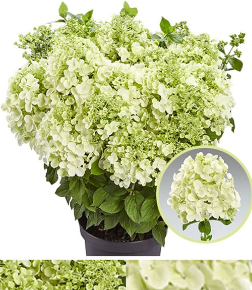 Метельчатая гортензия "Панорама" – эксклюзивная серия Патио немецкой селекции PAN, отличается невысокой, компактной формой куста, высотой до 100 см, рано зацветает и обильно цветет, неприхотлив в уходе. Соцветия плотные, конусовидные, в начале цветения нежно-зелёного цвета, затем белые, к осени приобретают лаймовый оттенок. На солнечном участке или в легкой полутени цветение будет пышнее и ярче. Ветви крепкие, прямостоячие. Цветет с июня по сентябрь. Почва кислая, влажная, но без застоя воды. Зимостоек, неприхотлив. Прекрасно смотрится как бордюрное растение, так можно выращивать и в кашпо.